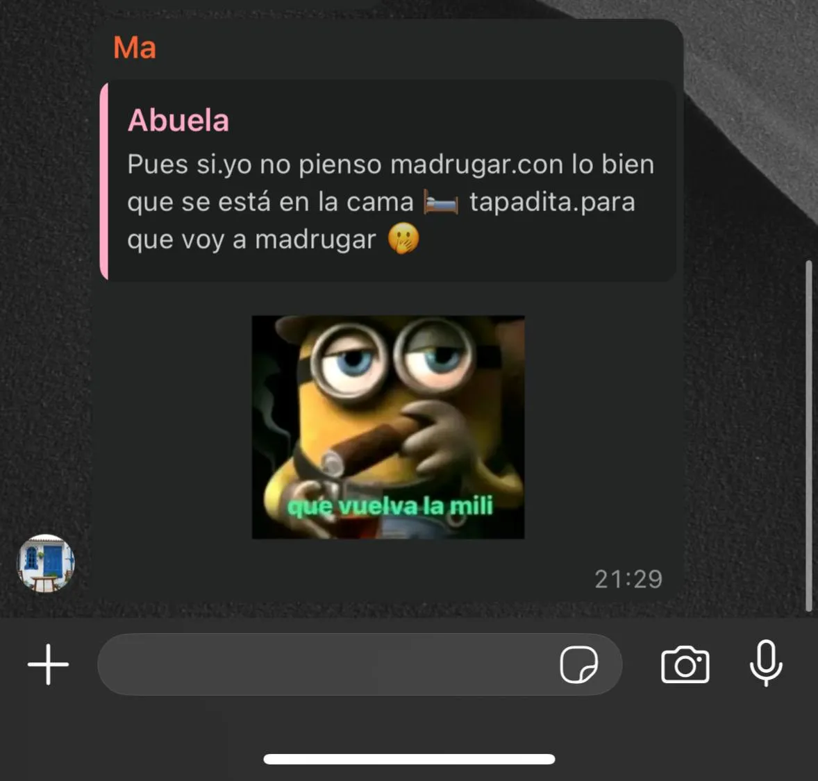 Pero lo interesante ocurrió a las 5 AM, cuando, alborotado, me levanté para ir al baño. Total, meo, tiro de la cadena, me lavo las manos y me voy. Todo normal hasta aquí. Cuando vuelvo, me acuesto y me enrollo en la manta porque hace frío, y para mi sorpresa y terror, justo cuando creía haber encontrado la postura, heme aqui que el móvil de caótico deleitóme de nuevo con su música.